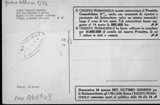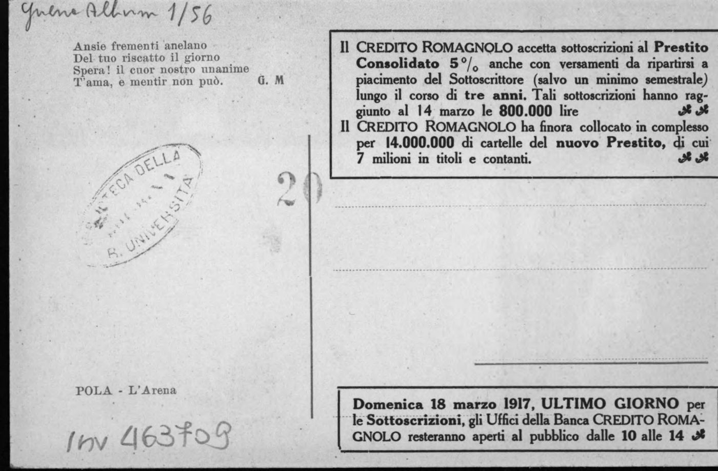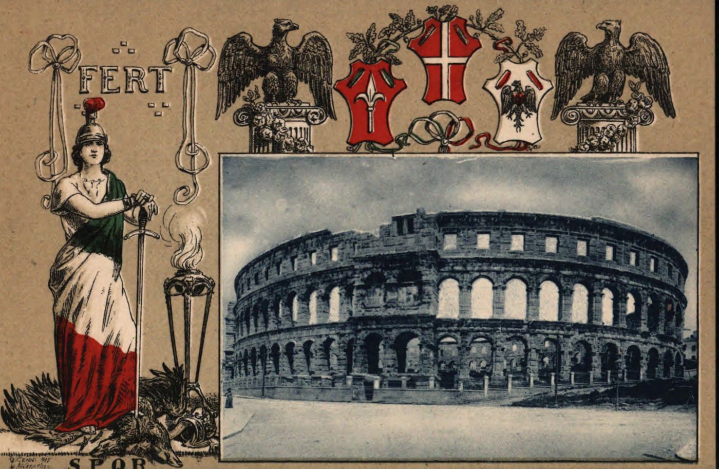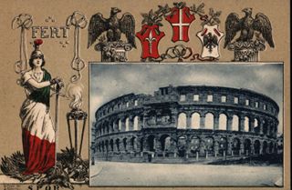 Descrizione: Pola, l'Arena. - [S.l.: s.n., 1917]. - 1 cartolina illustrata: tipografia, color. ; 90x140 mm.
