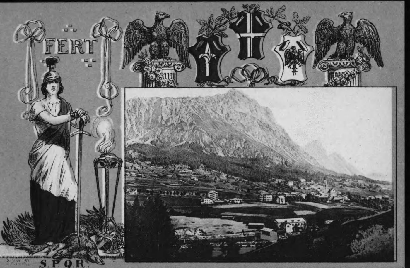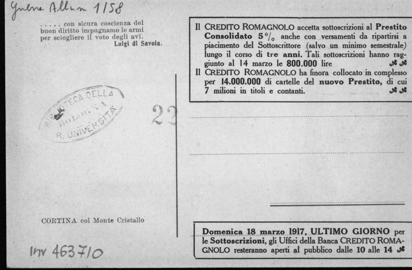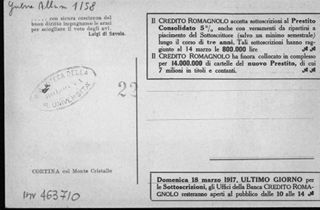 Descrizione: Cortina col Monte Cristallo. - [S.l.: s.n., 1917]. - 1 cartolina illustrata: tipografia, color. ; 90x140 mm.