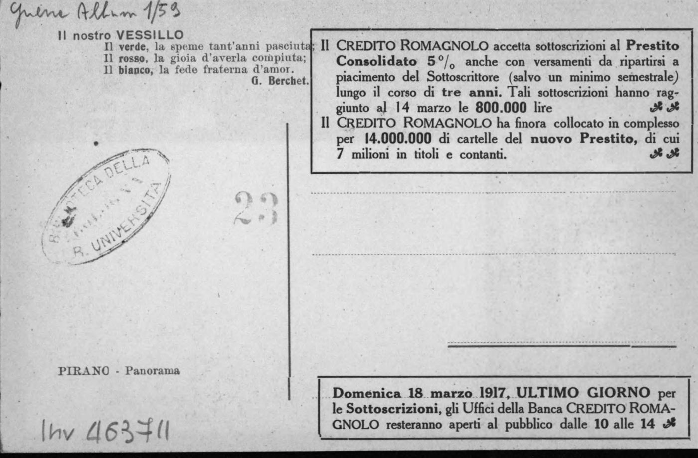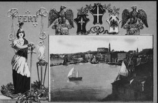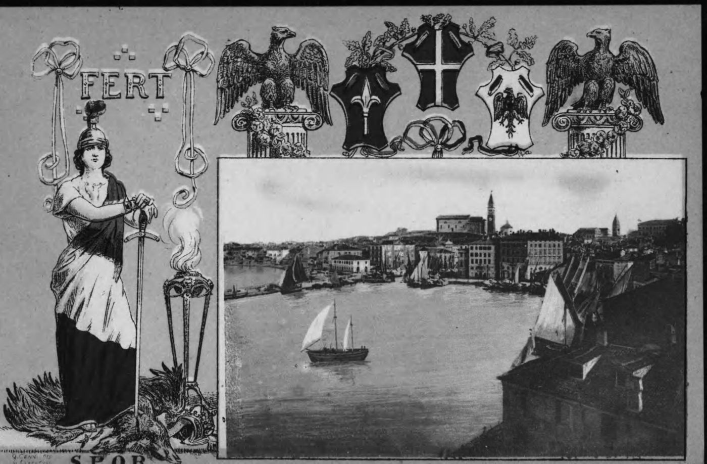 Descrizione: Pirano, panorama. - [S.l.: s.n., 1917]. - 1 cartolina illustrata: tipografia, color. ; 140x90 mm.