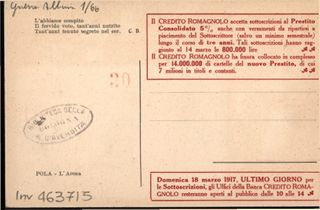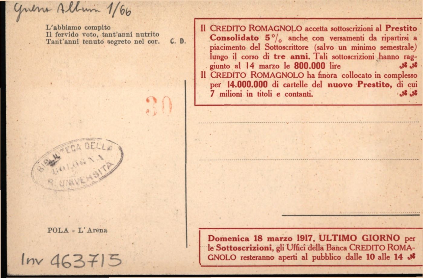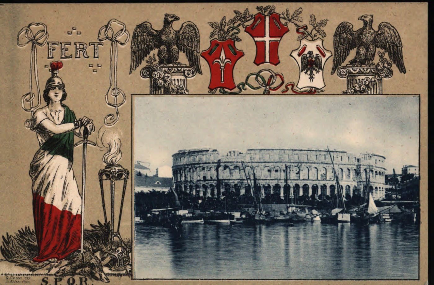 Descrizione: Pola, l'Arena . - [S.l.: s.n., 1917]. - 1 cartolina illustrata: tipografia, color. ; 90x140 mm.