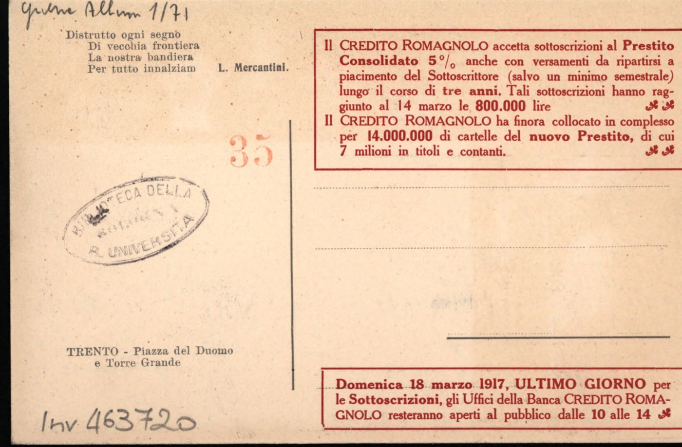 Note: Titolo sul verso. - Data desunta dal riquadro informativo sul verso in calce. - Sul verso citazione di L. Mercantini