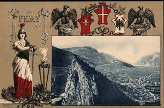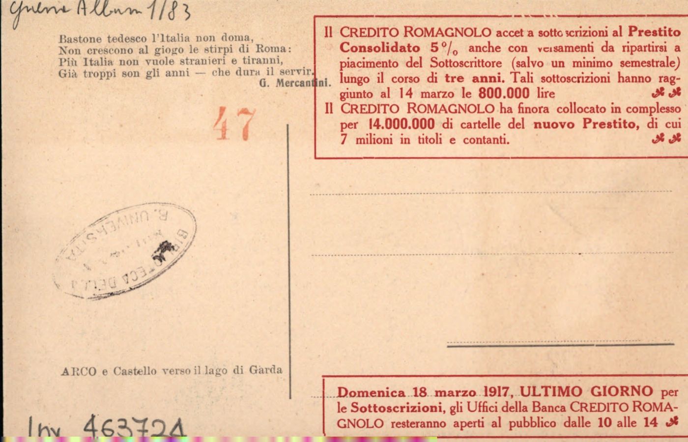 Descrizione: Arco e castello verso il lago di Garda. - [S.l.: s.n., 1917]. - 1 cartolina postale: tipografia, color. ; 90x140 mm.