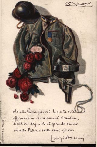 Descrizione: Se alla Patria per voi le nostre vite offrimmo in sacra purità d'ardore, siate voi degni di sì grande amore ed alla Patria i vostri beni offrite / [testo di] Luigi Orsini ; [illustrazione di] A. Mauzan. - Milano: G. Ricordi & C., [1917]. - 1 cartolina illustrata: tipografia, color. ; 140x90 mm.