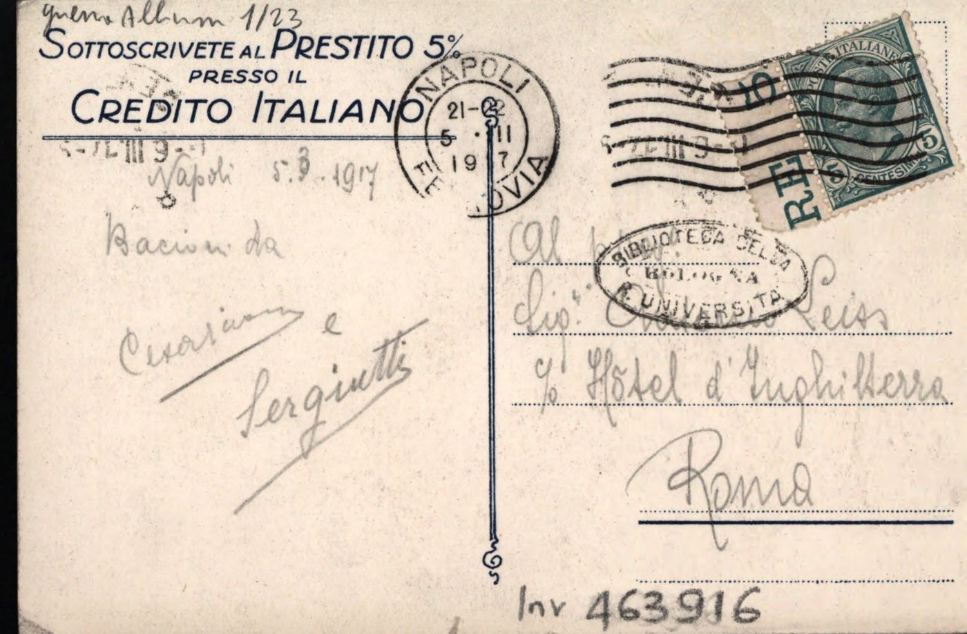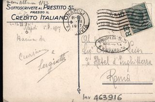 Note: Titolo e autori nell'illustrazione sul recto. - Sul verso: Sottoscrivete al prestito 5% presso il credito italiano. - Data di sottoscrizione del 4. prestito nazionale, cfr. Breda, R., Le cartoline dei prestiti di guerra, (1915-1942), Roma, 1992 e Rubetti G., La pubblicità nei prestiti italiani di guerra, Milano, 1918.