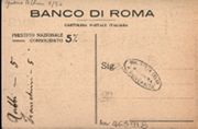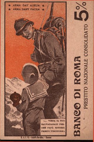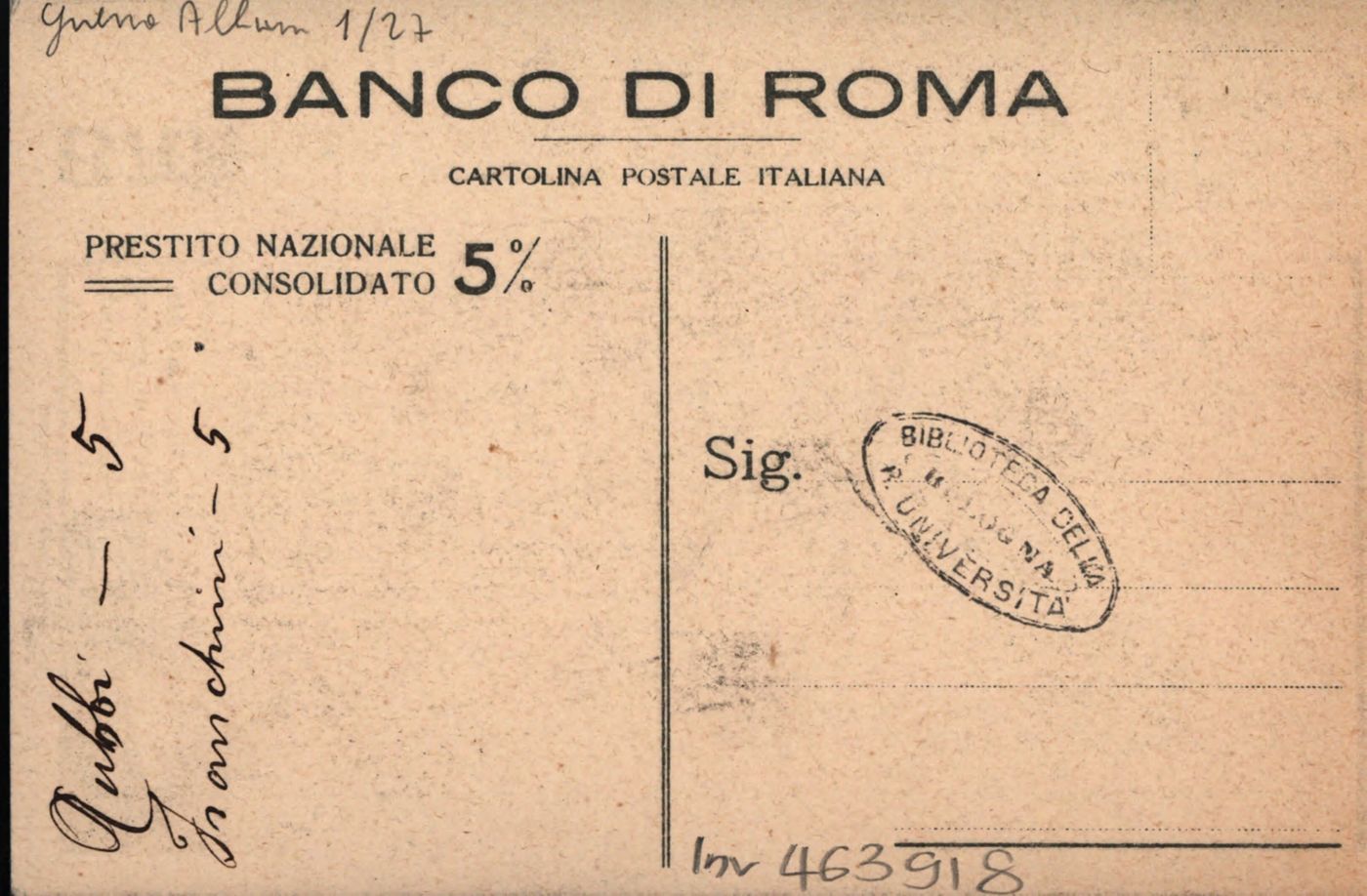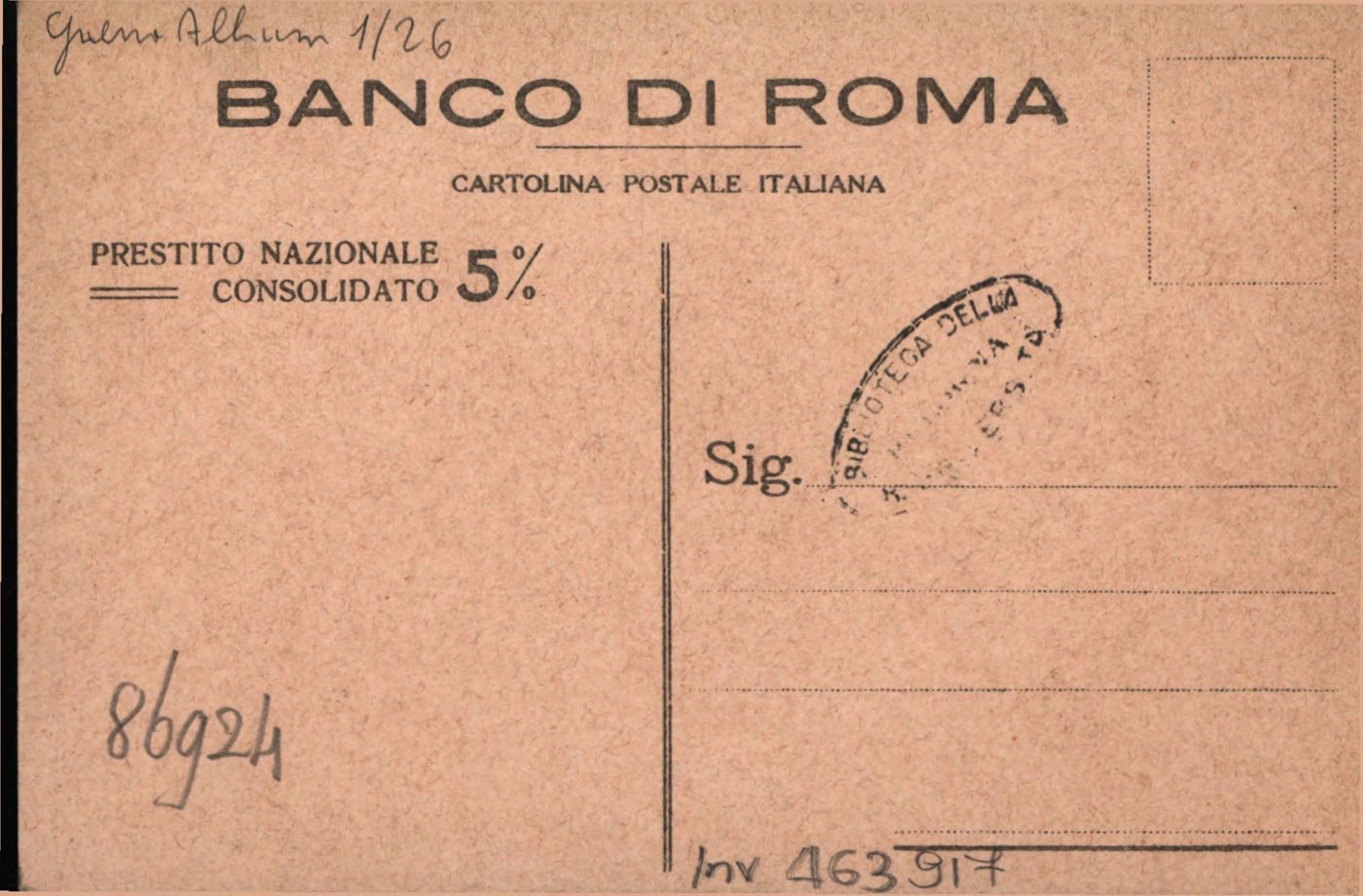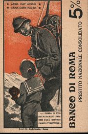 Descrizione: Banco di Roma, Prestito nazionale consolidato 5% / [illustrazione di] A. Craffonara. - Genova: S.A.I.G. Adolfo Barabino, [1917]. - 1 cartolina illustrata: tipografia, color. ; 140x90 mm.