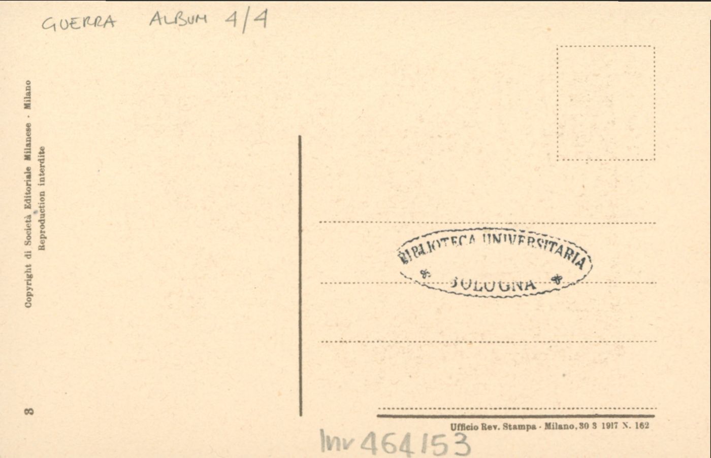 Note: Data dell'Ufficio revisione stampa di Milano sul verso in calce.