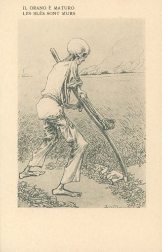 Descrizione: 3: Il grano è maturo / Louis Raemaekers. - Milano: Società editoriale milanese, [1917]. - 1 cartolina illustrata: fototipia, b/n ; 140x90 mm.