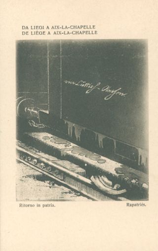 Descrizione: 11: Da Liegi a Aix-la-Chapelle / Louis Raemaekers. - Milano: Società editoriale milanese, [1917]. - 1 cartolina illustrata: fototipia, b/n ; 140x90 mm.