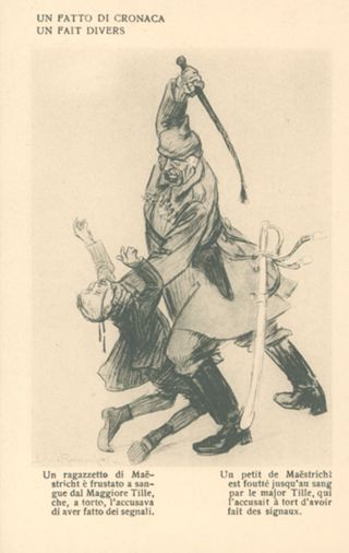 Note: Data dell'Ufficio revisione stampa di Milano sul verso in calce. - In calce all'illustrazione: Un ragazzetto di Maestricht è frustato a sangue dal maggiore Tille, che, a torto, l'accusava di aver fatto dei segnali