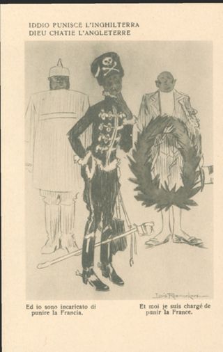 Descrizione: 29: Iddio punisce l'Inghilterra / Louis Raemaekers. - Milano: Società editoriale milanese, [1917]. - 1 cartolina illustrata: fototipia, b/n ; 140x90 mm.