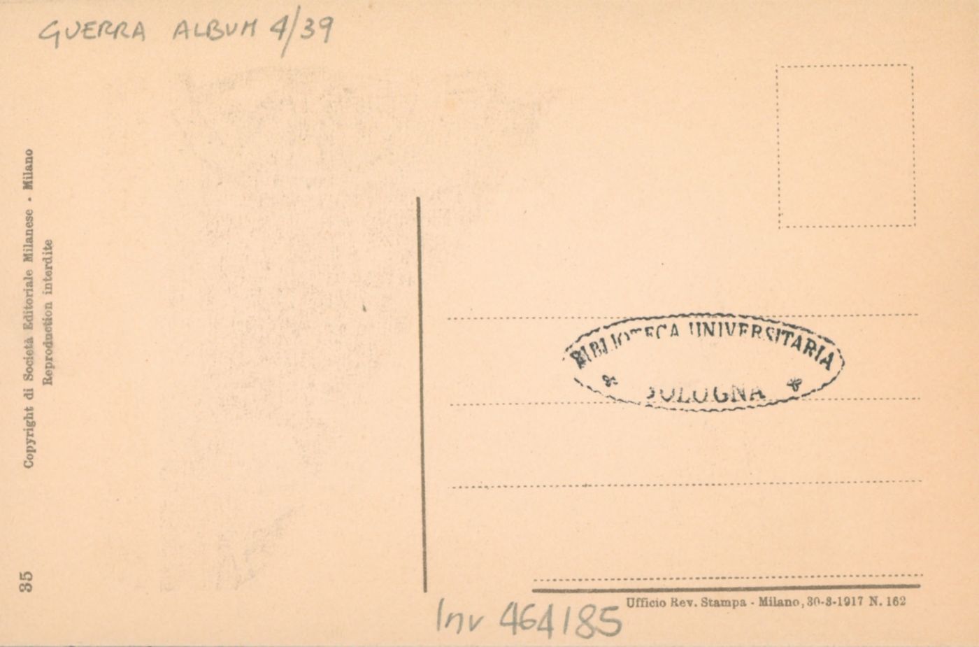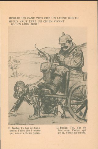 Note: Data dell'Ufficio revisione stampa di Milano sul verso in calce. - Testo in calce all'illustrazione: Il boche: Tu hai del buon senso: l'altro che è morto qui non era che un pazzo