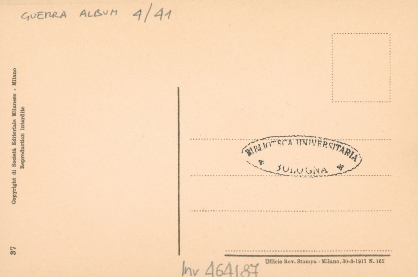 Note: Data dell'Ufficio revisione stampa di Milano sul verso in calce. - Testo in calce all'illustrazione: Io È mia la tua sofferenza - è mia la tua sorte