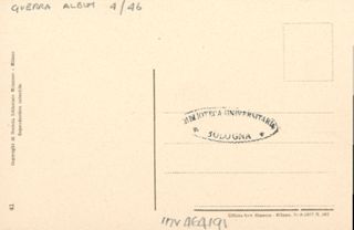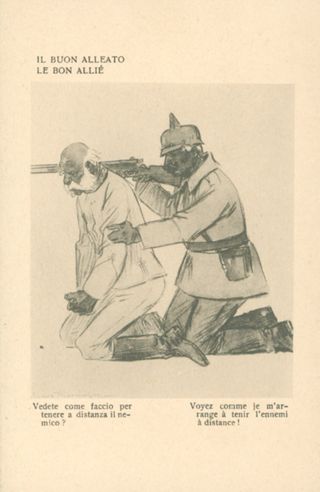 Note: Data dell'Ufficio revisione stampa di Milano sul verso in calce. - Testo in calce all'illustrazione: Vedete come faccio per tenere a distanza il nemico?