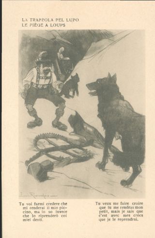 Descrizione: 44: La trappola pel lupo / Louis Raemaekers. - Milano: Società editoriale milanese, [1917]. - 1 cartolina illustrata: fototipia, b/n ; 140x90 mm.