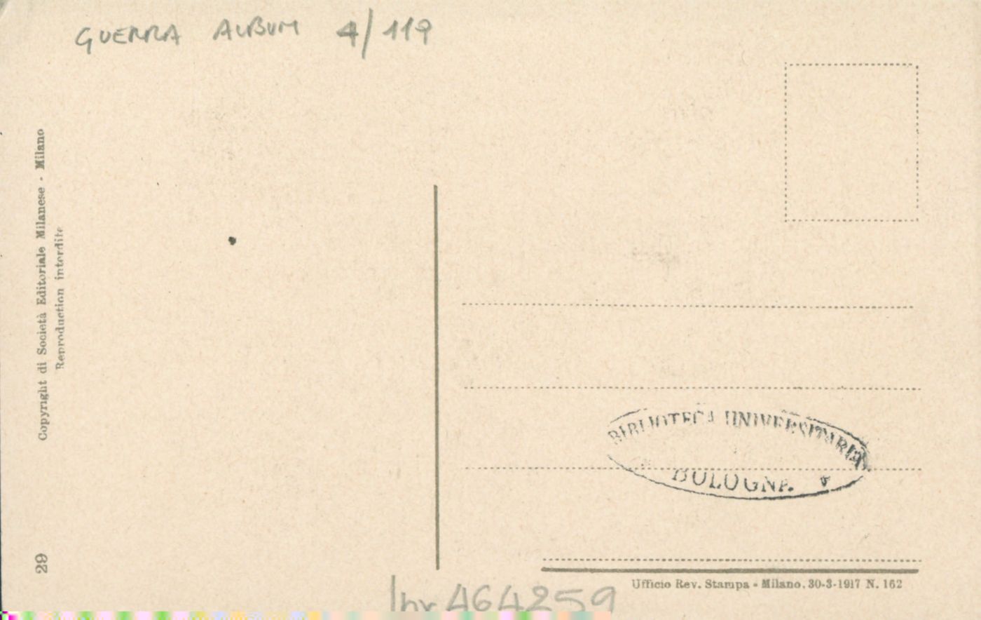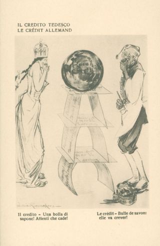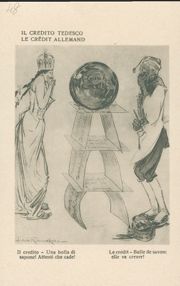 Note: Data dell'Ufficio revisione stampa di Milano sul verso in calce. - Testo in calce all'illustrazione: Il credito - Una bolla di sapone! attenti che cade!