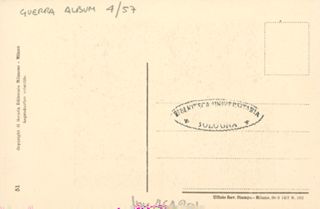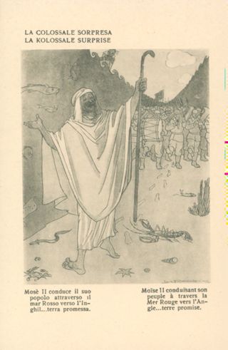 Note: Data dell'Ufficio revisione stampa di Milano sul verso in calce. - Testo in calce all'illustrazione: Mosè 2. conduce il suo popolo attraverso il mar Rosso verso l'Inghil...terra promessa