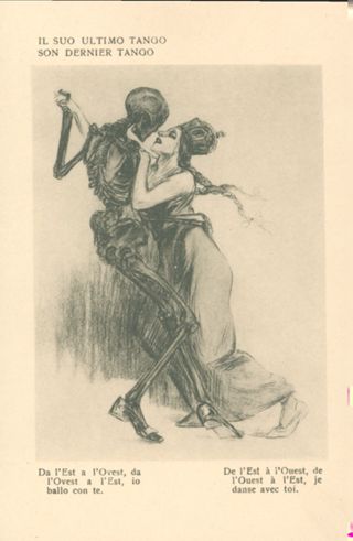 Descrizione: 53: Il suo ultimo tango / Louis Raemaekers. - Milano: Società editoriale milanese, [1917]. - 1 cartolina illustrata: fototipia, b/n ; 140x90 mm.