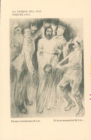 Descrizione: 54: La Pasqua del 1915 / Louis Raemaekers. - Milano: Società editoriale milanese, [1917]. - 1 cartolina illustrata: fototipia, b/n ; 140x90 mm.