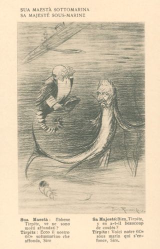Note: Data dell'Ufficio revisione stampa di Milano sul verso in calce. - In calce all'illustrazione, dialogo immaginario tra Sua Maestà e Tirpitz