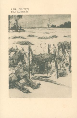 Descrizione: 63: I fili dentati / Louis Raemaekers. - Milano: Società editoriale milanese, [1917]. - 1 cartolina illustrata: fototipia, b/n ; 140x90 mm.