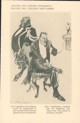 Descrizione: 66: Ancora dei liquidi infiammati / Louis Raemaekers. - Milano: Società editoriale milanese, [1917]. - 1 cartolina illustrata: fototipia, b/n ; 140x90 mm.