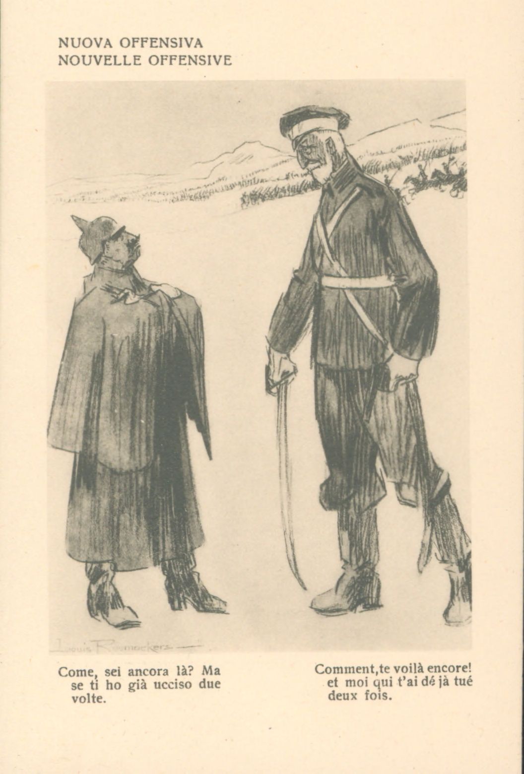 Descrizione: 70: Nuova offensiva / Louis Raemaekers. - Milano: Società editoriale milanese, [1917]. - 1 cartolina illustrata: fototipia, b/n ; 140x90 mm.