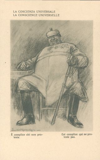 Descrizione: 85: La coscienza universale / Louis Raemaekers. - Milano: Società editoriale milanese, [1917]. - 1 cartolina illustrata: fototipia, b/n ; 140x90 mm.