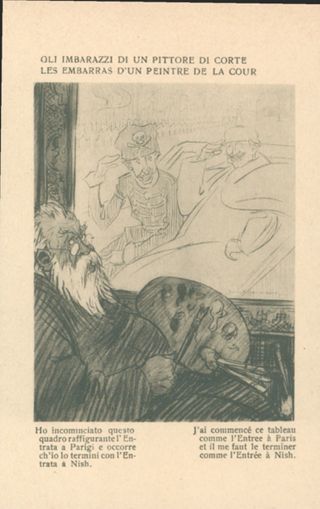 Note: Data dell'Ufficio revisione stampa di Milano sul verso in calce. - Testo in calce all'illustrazione: Ho cominciato questo quadro raffigurante l'entrata a Parigi e occorre ch'io lo termini con l'entrata a Nish