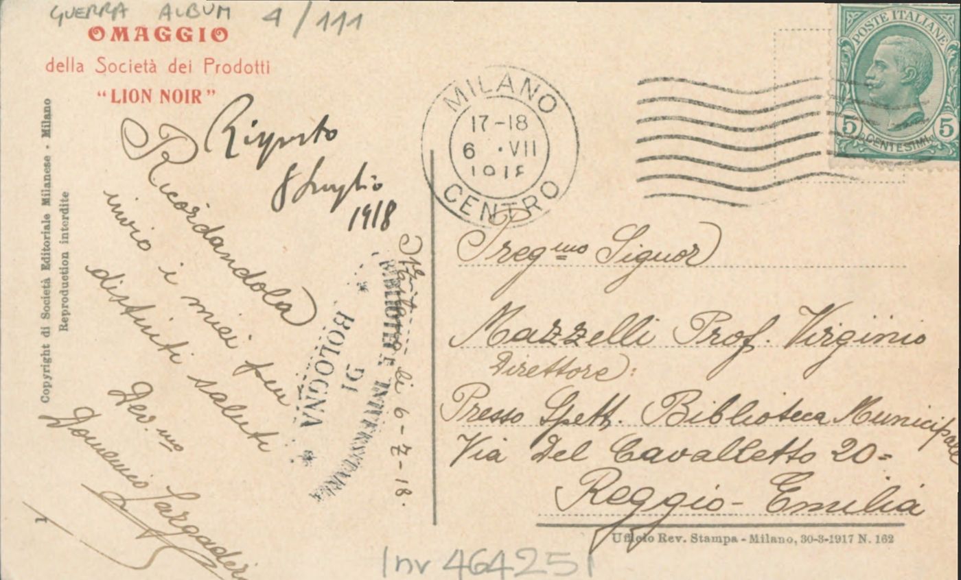 Note: Data dell'Ufficio revisione stampa di Milano sul verso in calce. - Sul verso, in sovrastampa rossa: Omaggio della Società dei prodotti Lion Noir.