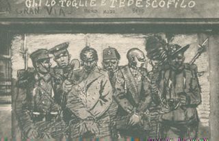 [Guglielmo 2. di Germania, Francesco Giuseppe 1. d'Austria e Mehmet 5. in catene scortati da soldati italiani]