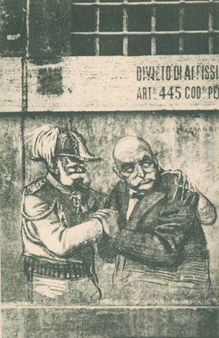 Descrizione: [Francesco Giuseppe 1. d'Austria passa del denaro a Giovanni Giolitti]. - Roma: Danesi, [1917]. - 1 cartolina illustrata: fotolitografia, b/n ; 90x140 mm.