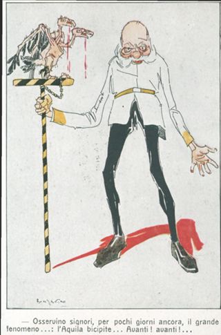 Descrizione: Osservino signori, per pochi giorni ancora, il grande fenomeno, l'aquila bicipite... Avanti! Avanti! / Bonzagni. - Milano: G. Modiano e co., [prima del 1917]. - 1 cartolina illustrata: litografia, color. ; 139x89 mm.