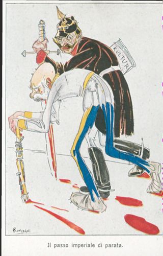 Descrizione: Il passo imperiale di parata / Bonzagni. - Milano: G. Modiano e co., [prima del 1917]. - 1 cartolina illustrata: litografia, color. ; 139x89 mm.