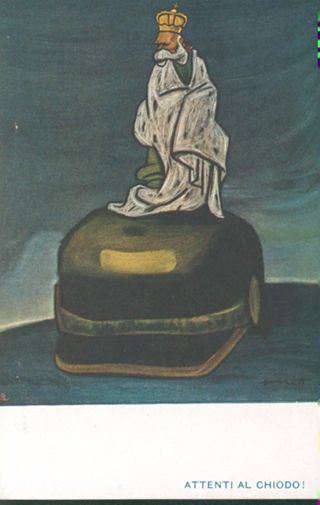 Descrizione: Attenti al chiodo! / [illustrazione di] Pozzati. - Bologna: Giacomo Chiarini & C., 1916. - 1 cartolina illustrata: fototipia, color ; 138x88 mm.