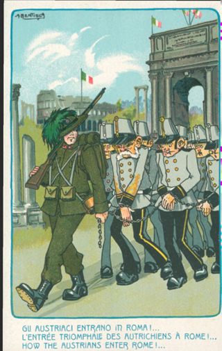 Descrizione: Gli austriaci entrano in Roma! / [illustrazione di] A. Bertiglia. - [S.l.]: C.C.M, [191.?]. - 1 cartolina illustrata: fototipia ; 140x89 mm.