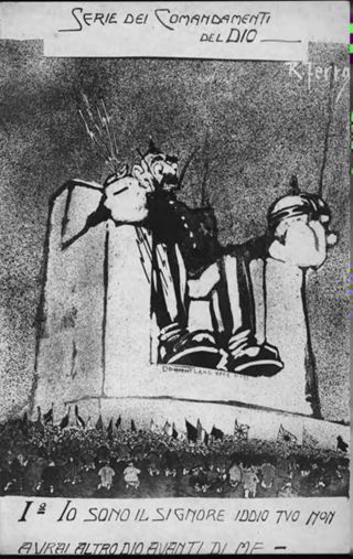 Descrizione: 1. Io sono il signore Iddio tuo non avrai altro Dio avanti di me / [illustrazione di] R. Ferro. - Roma: P. Bernardini, [tra il 1915 e il 1918]. - 1 cartolina illustrata: fototipia, b/n ; 136x86 mm.