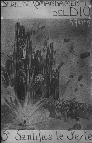 Note: Nome dell'Autore sull'illustrazione. - Nome dell'editore da timbro ad inchiostro sul verso. - Nell'illustrazione: Bombardamento di una cattedrale