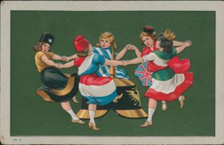 Bambine in costume tipico delle nazioni alleate dell'Intesa fanno un girotondo attorno ad un elmo chiodato