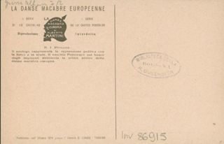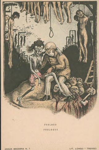 Note: Titolo in calce all'illustrazione in italiano e in francese. - Sul verso didascalia: Il prologo rappresenta la repressione politica con la forca e la scure. Il vecchio Francesco nel bosco degli impiccati abbraccia la prima attrice della danza macabra europea