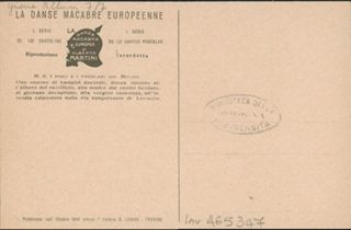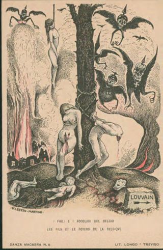 Note: Titolo in calce all'illustrazione in italiano e in francese. - Sul verso didascalia: Uno stormo di vampiri decorati, danza intorno all'albero del sacrificio, alla madre dal ventre fucilato, al giovane decapitato, alla vergine immolata, all'infanzia calpestata sulla via sanguinante di Lovanio
