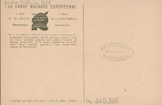 Note: Titolo in calce all'illustrazione in italiano e in francese. - Sul verso didascalia: Il famelico imperatore, divora giovani, cuori e vino di vena. Quando appare sul piatto l'ombra di Banco , Poincarré. E la forte Inghilterra al grido War! War! (guerra guerra!) colle minaccianti catene di Napoleone