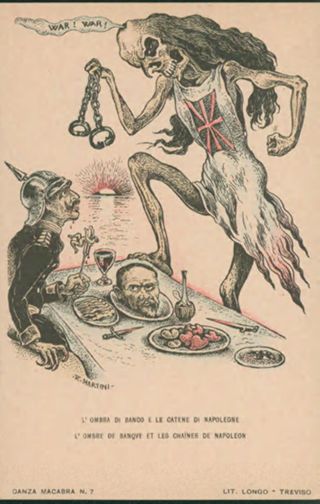 Descrizione: L'ombra di banco e le catene di Napoleone / A. Martini. - Treviso: Longo, 1914. - 1 cartolina illustrata: litografia, color ; 140x90 mm.