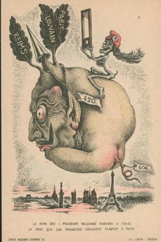 Note: Titolo in calce all'illustrazione in italiano e in francese. - Sul verso didascalia: 420-606 due numeri che forse salveranno la Germania? Ma la rapa teutonica non può alignare sul suolo della civiltà latina
