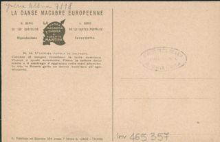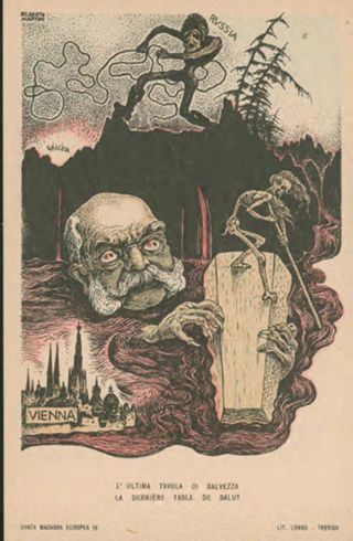 Note: Titolo in calce all'illustrazione in italiano e in francese. - Sul verso didascalia: Cascate di sangue inondano la terra austriaca. Vienna è quasi sommersa. Passa la zattera della morte e il naufrago s'aggrappa colle mani adunche. In alto la Russia getta un laccio austriaco all'agonizzante