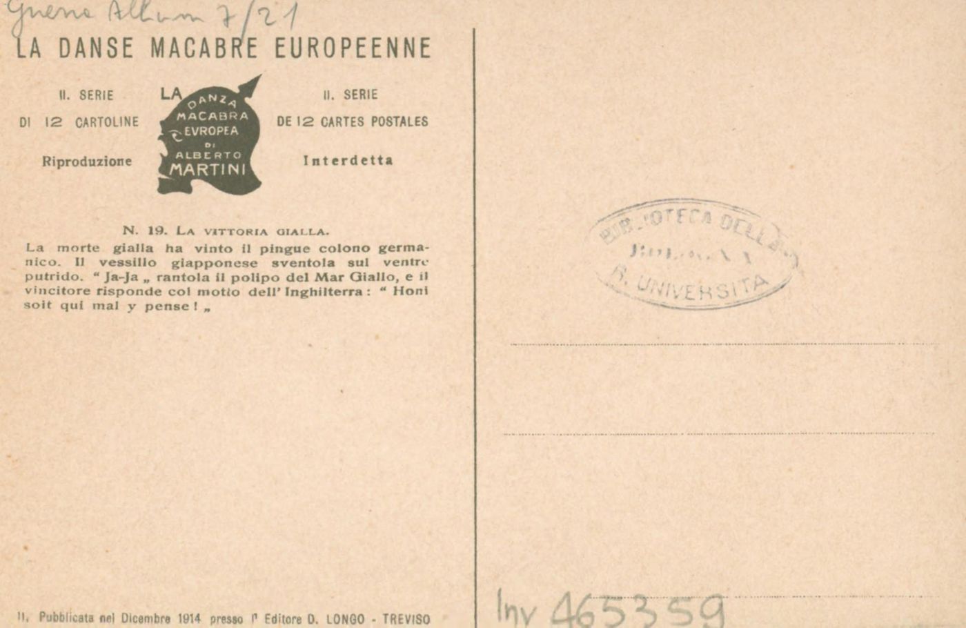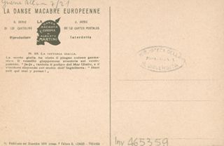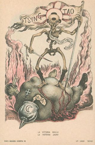 Note: Titolo in calce all'illustrazione in italiano e in francese. - Sul verso didascalia: La morte gialla ha vinto il pingue colono germanico. Il vessillo giapponese sventola sul ventre putrido. Ja-Ja rantola il polipo del mar Giallo, e il vincitore risponde col motto dell'Inghilterra: Honi soit qui mal y pense!