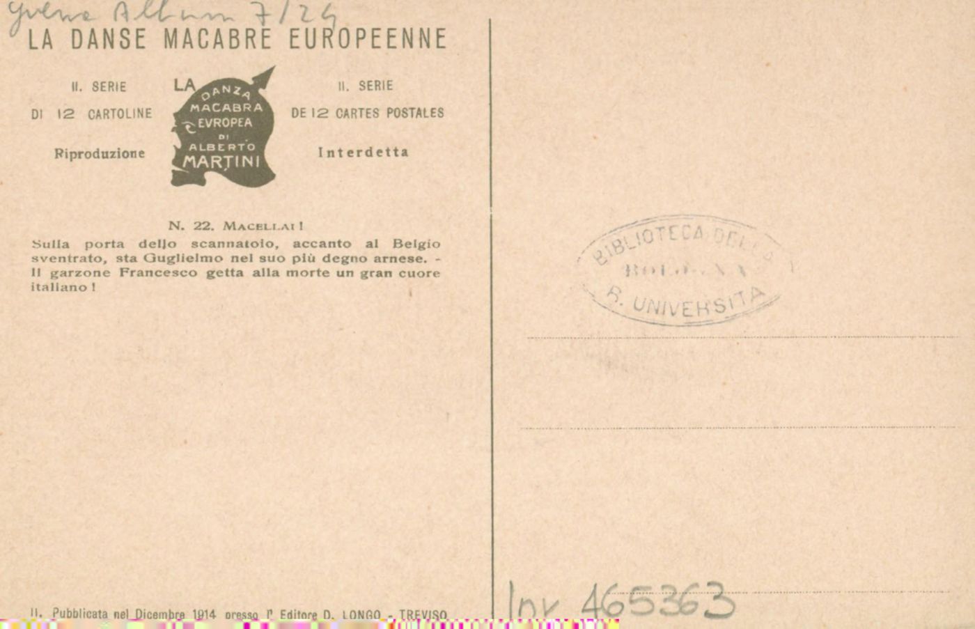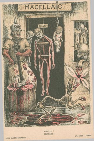 Note: Titolo in calce all'illustrazione in italiano e in francese. - Sul verso didascalia: Sulla porta dello scannatoio, accanto al Belgio sventrato, sta Guglielmo nel suo più degno arnese. Il garzone Francesco getta alla morte un gran cuore italiano!