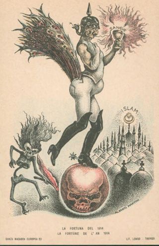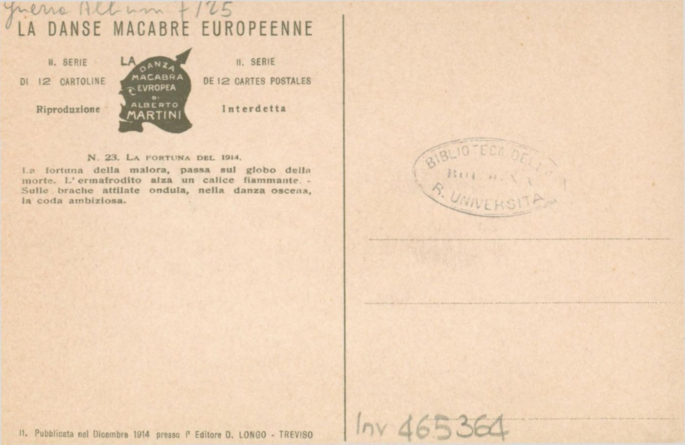 Descrizione: La fortuna del 1914 / Alberto Martini. - Treviso: Longo, 1914. - 1 cartolina illustrata: litografia, color. ; 140x90 mm.