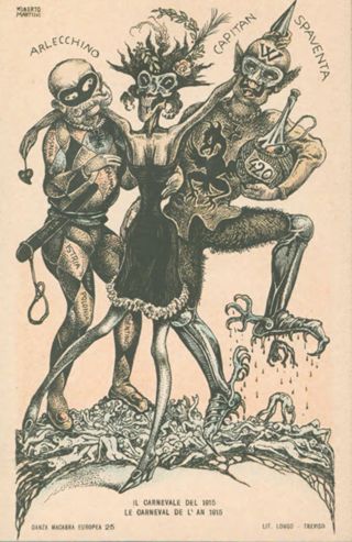 Note: Titolo in calce all'illustrazione in italiano e in francese. - Nell'illustrazione Francesco Giuseppe 1. d'Austria vestito da Arlecchino e Guglielmo 2. di Germania vestito da Capitan Spaventa danzano con la morte mascherata su corpi straziati