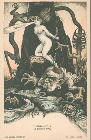 Note: Titolo in calce all'illustrazione in italiano e in francese. - Data di pubblicazione dalla prima illustrazione della serie; cfr. Danza macabra europea. La tragedia della grande guerra nelle 54 cartoline litografate, Genova, Le mani, 2008. - Nell'illustrazione Zara prigioniera e insidiata dal mostro austriaco con il volto di Francesco Giuseppe 1. d'Austria chiede aiuto all'Italia