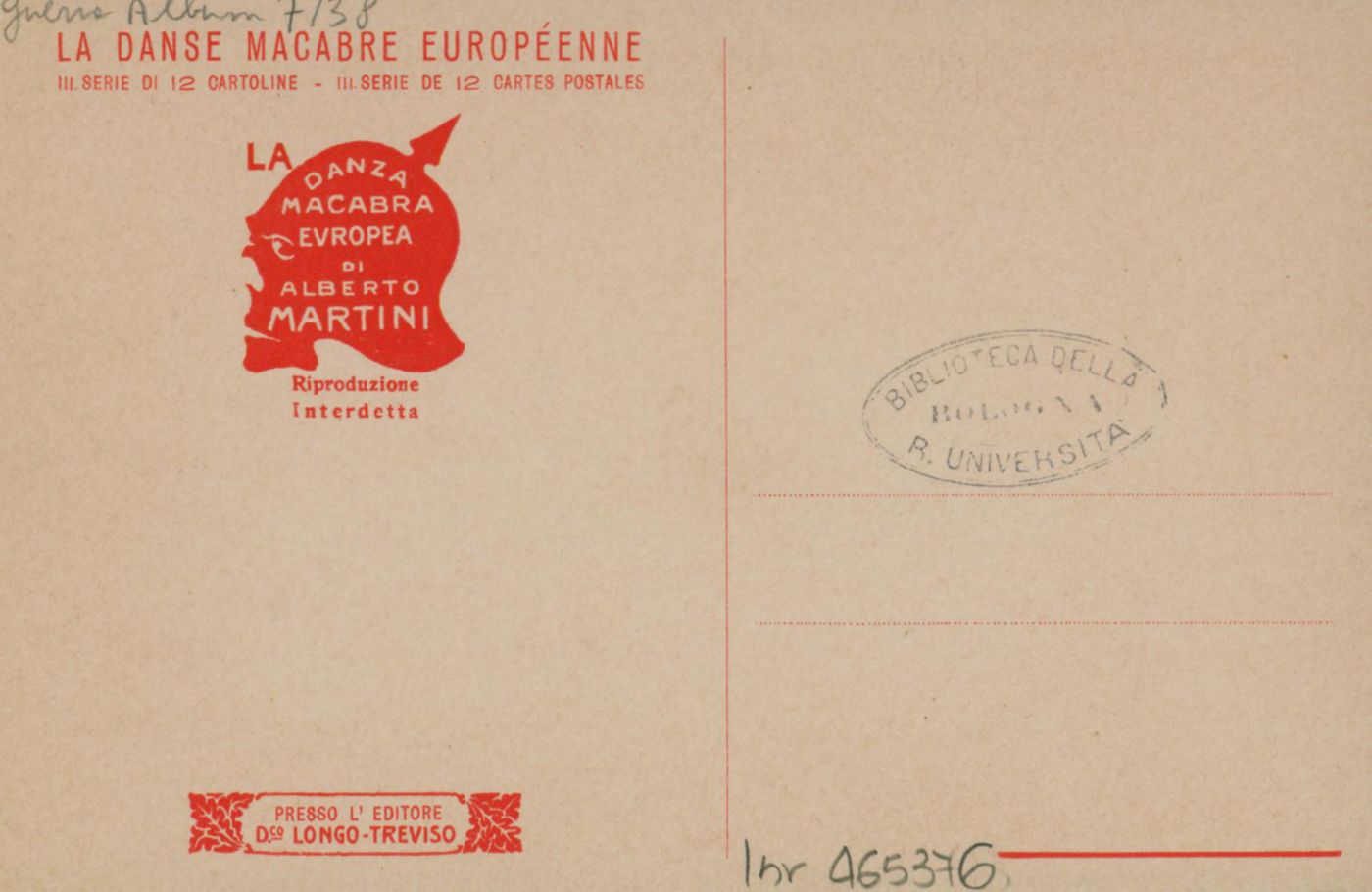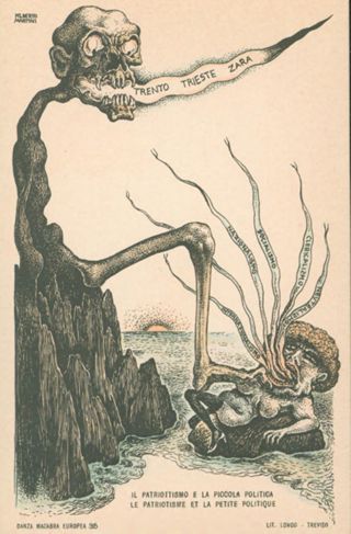 Note: Titolo in calce all'illustrazione in italiano e in francese. - Data di pubblicazione dalla prima illustrazione della serie; cfr. Danza macabra europea. La tragedia della grande guerra nelle 54 cartoline litografate, Genova, Le mani, 2008. - Nell'illustrazione allegorica Il patriottismo italiano calpesta la politica